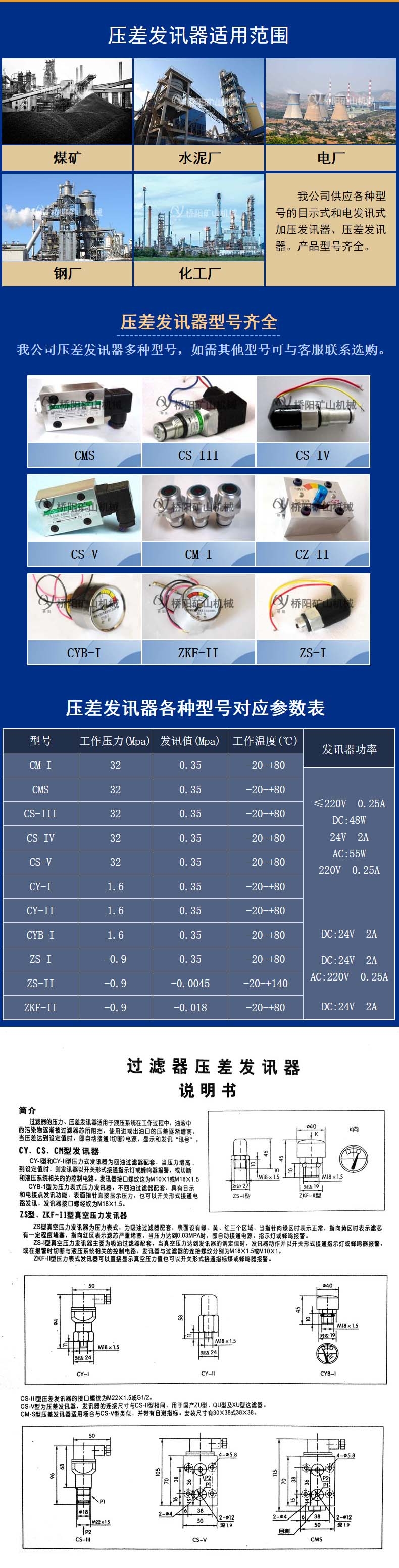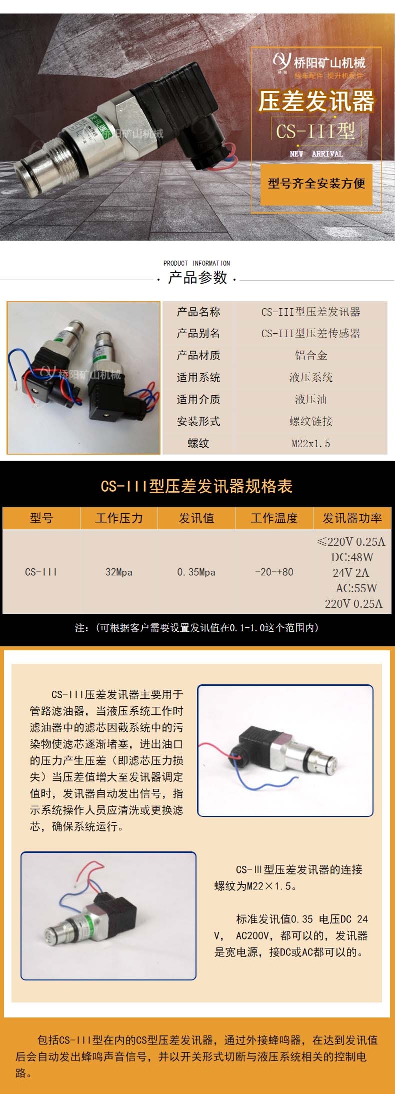 洛阳桥阳矿山生产的CS型压差发讯器,具备诸多优点:在液压系统启动或瞬时流量增减时,不易发出误讯号;不会因碰撞等原因导致原来设定的压差发讯值失准;不但以开关形式发出滤芯堵塞的声音讯号,并可以开关形式切断与液压系统相关的控制电路,达到主机和液压系统正常运行的目的;交直流均可,交流电压达220V。