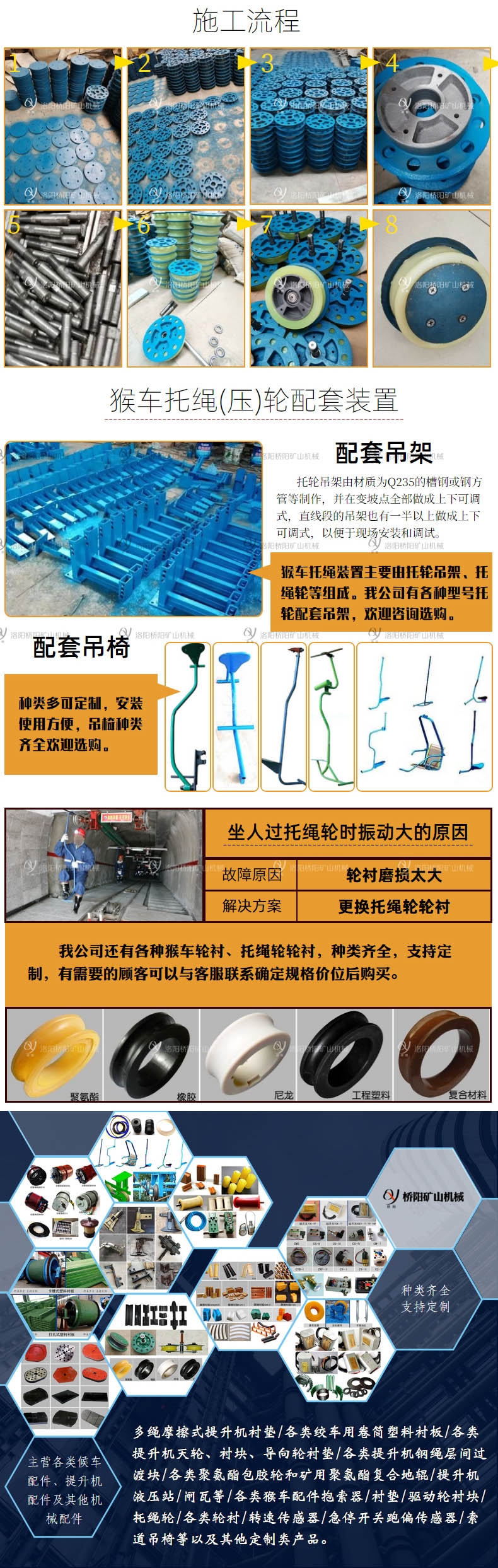桥阳矿山机械有限公司生产的猴车托轮主要有两类单托轮和双托轮,猴车双托轮规格可分为直径180、直径200、直径240三种不同规格,根据钢丝绳大小、抱索器样式及托压轮分布结构进行配比。猴车单托轮和双托轮生产厂家,品种多、规格全、猴车整机到配件及辅助材料配套齐全,支持定制,欢迎订购。