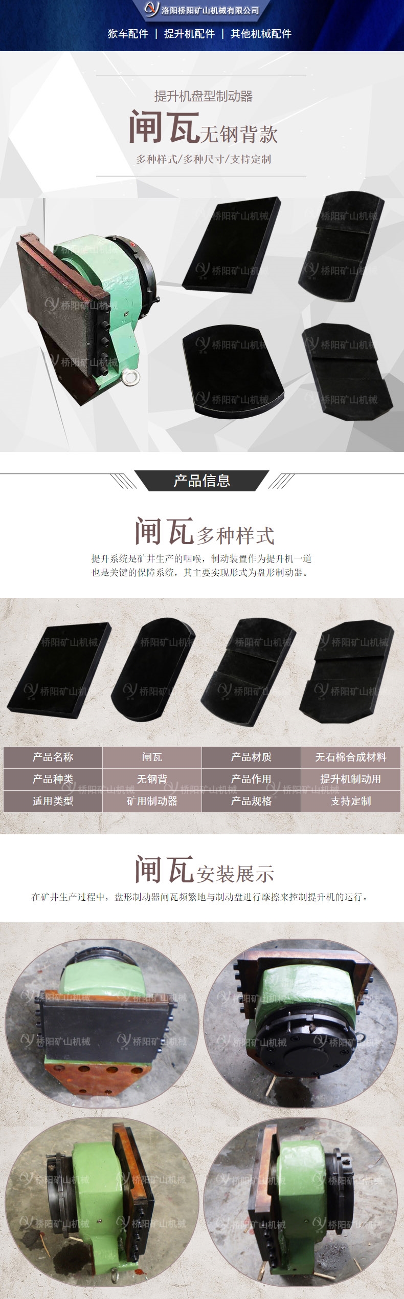 提升系统是矿井生产的咽喉,制动装置作为提升机保障系统,其主要实现形式为盘形制动器。制动多是靠摩擦付的摩擦来实现的,是一个动能转变热能的过程,用作摩擦付的摩阻材料,是制动器运行的保障。闸瓦是矿井提升机制动器的零件之一。