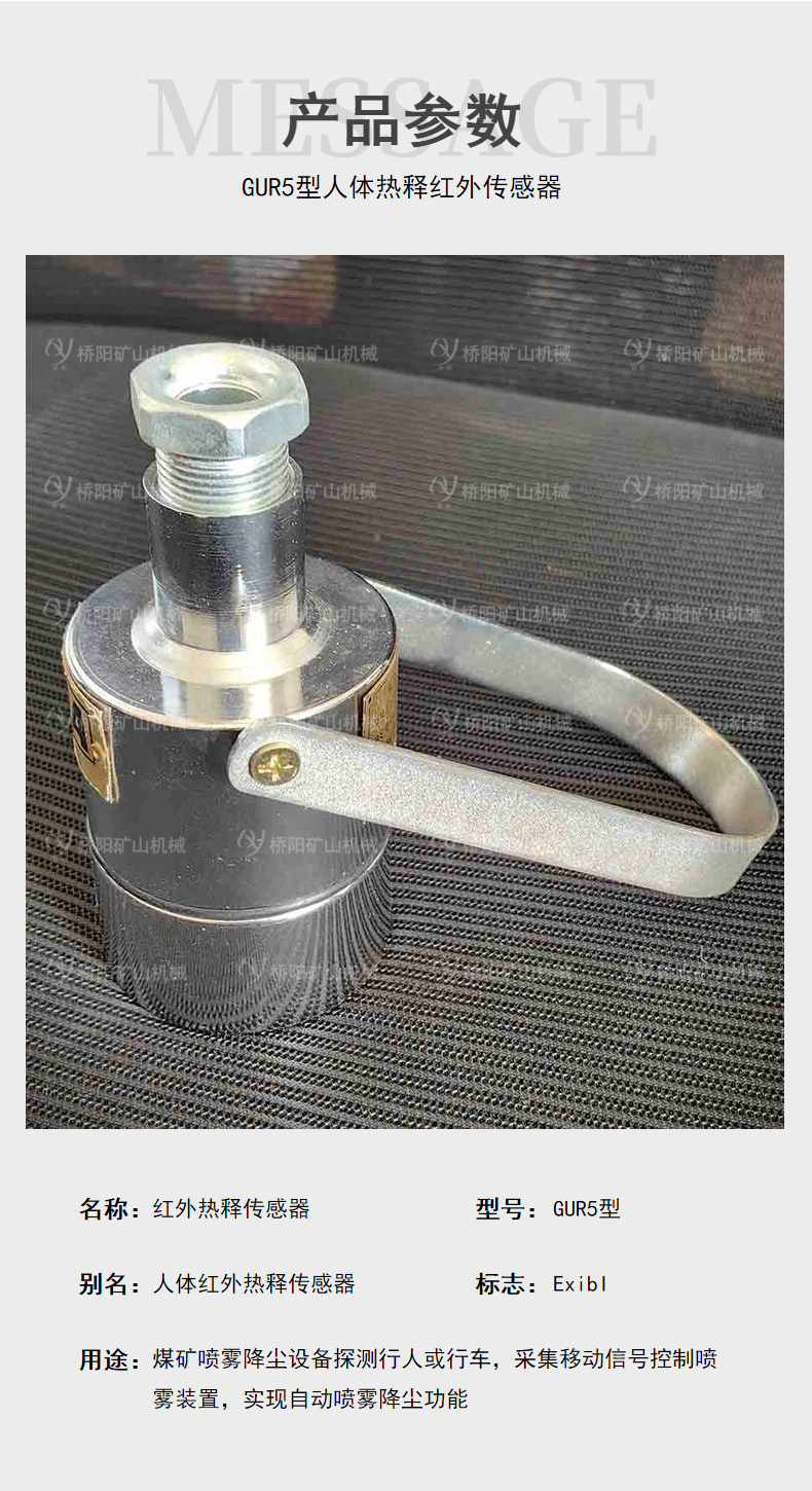 装载机用GUR5热释温控传感器人体传感器用途:用于煤矿井底车场、猴车沿线等场所作人员检测用,实现声光报jing或语音提示,提醒现场人员注意安全。