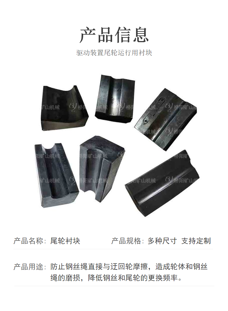 尾轮装置中的尾轮在钢丝绳张紧的过程中起减少摩擦及导向作用,钢丝绳在运行中张紧力发生变化时,通过滚轮在滚轮导轨内的前后移动,达到随时调节钢丝绳的张力和挠度,以保证架空乘人装置在正常运行时牵引钢丝绳具有恒定的张紧力和适当的挠度。尾轮衬块安装在轮槽中,防止钢丝绳直接与迂回轮摩擦,造成轮体和钢丝绳的磨损,降低钢丝和尾轮的更换频率,适用于架空乘人猴车索道用;安装方便快捷,不需要夹板和紧固件。