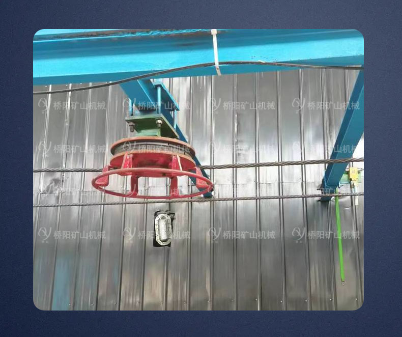 尾轮装置主要起牵引钢丝绳的换向作用,主要由四滑轮组1、迂回轮2、护圈3、迂回轮轴4、迂回轮架5、滚轮6、入绳口安全防护装置7等组成。