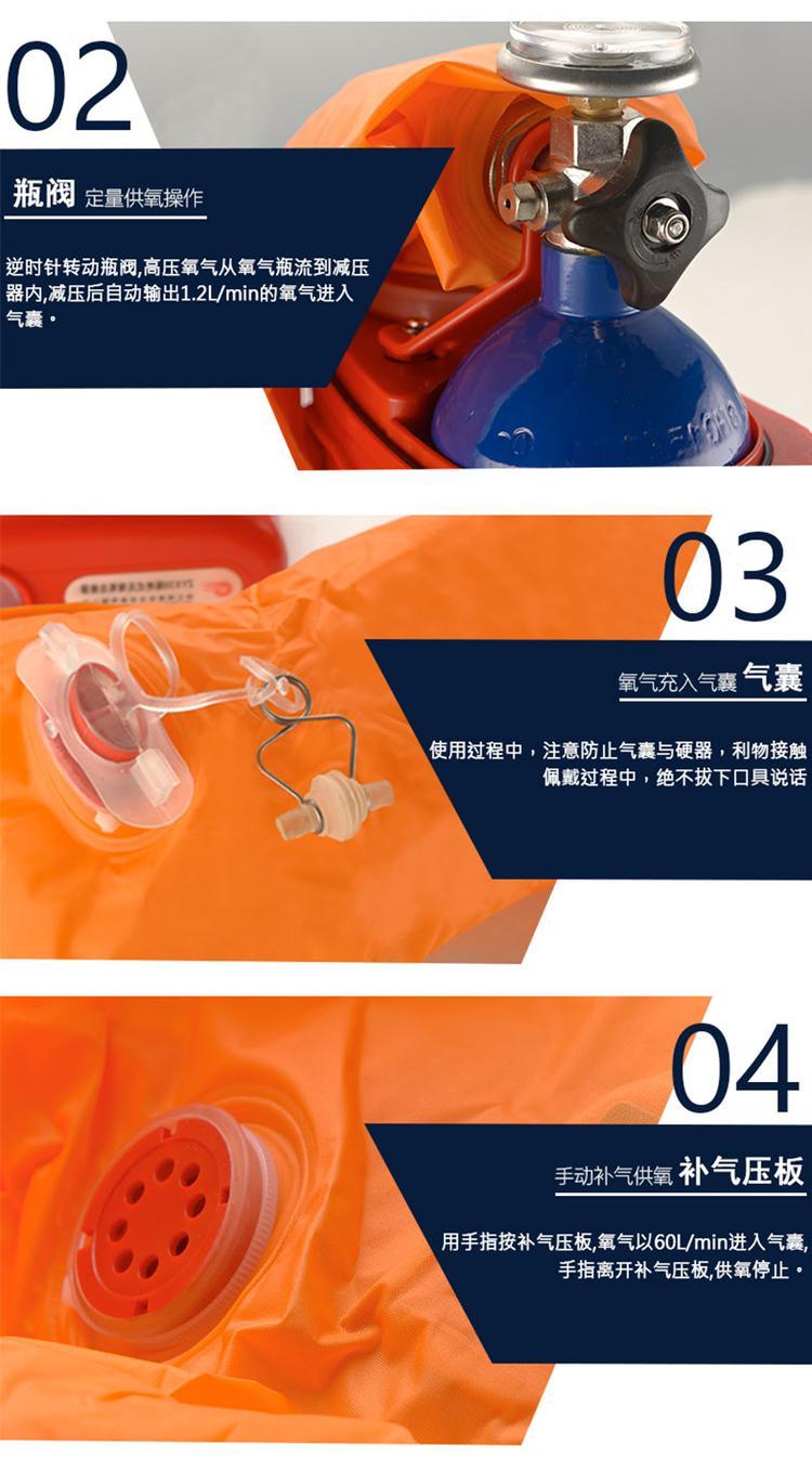 1111MicrosoftInternetExplorer402DocumentNotSpecified7.8 磅Normal0产品特点本自救器是以压缩氧气作为气源的隔绝再生式自救器,人体呼吸系统与外界隔绝,可以防止外界各种有毒有害气体进入,能满足遇险人员逃生时使用。本自救器具有三种供氧方式,定量供氧、自动补氧和手动补氧。使性能更加可靠、稳定。具有体积小、重量轻、携带方便等特点(外壳非金属材质符合GB3836.1-2010标准要求)。