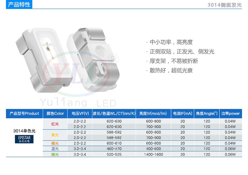 特性:可正面、侧面发光;散热好、低光衰;厚支架不易被折断