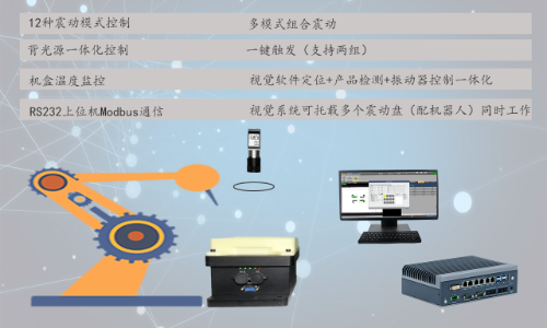 柔性振动盘利用音圈电机柔性供料振动平台解决现实生产中急需的能够通用多种工件, 且调换产品方便快速;并且能与拍照视觉定位、机器人抓取的系统互连互通。用音圈电机柔性供料振动平台可识别并控制物料的方向,可以通过控制 系统控制安装在四个角上的直线音圈电机的行程距离来控制取料盒内工件前 进/后退/向左/向右的方向和正反面的翻转。