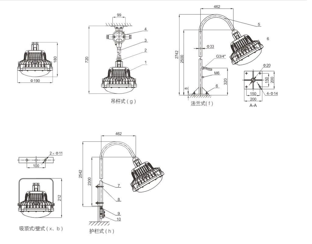 ● 常规出厂配置为吊杆式,如需其它安装方式,订货时请注明。