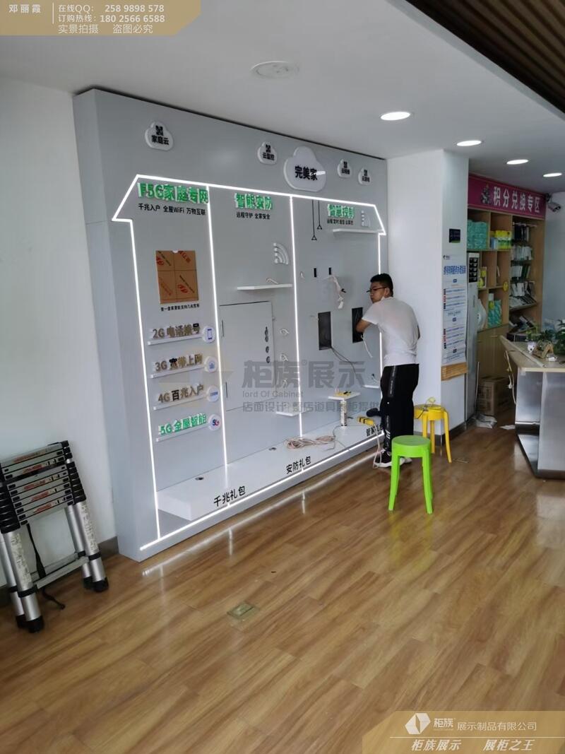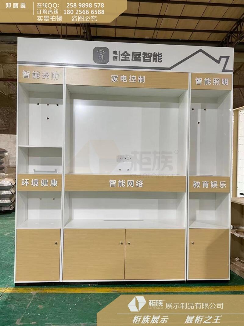 木质烤漆制作的展示柜坚固耐磨,防腐防潮,整体效果好,尤其是白色烤漆的展柜在展示柜行业使用非常广泛,全屋智能展示柜,集齐家庭,智能安防,智慧电视,生活品质等一起的一面展示墙,灯带的设计和发光字起到非常好的效果,因为灯光的醒目,展示柜是可以引发顾客的注意,从而吸引人们的目光,进而产生好奇,为了让展示的体验感更强,门锁展示会设计为真门开关展示,商家只要提供门锁或开孔施工图纸即可按商家需求开好定制的锁孔,电信新款木纹体验台,整体木纹烤漆,不同风格的柜台能展示不同的效果,不同品牌的通讯行业,每年都会进行不同的更新,工厂根据品牌商家的VI,SI制作每家门店需要的展示柜,工厂在制作柜台前需要跟门店负责人沟通门店的面积,根据每个区域的尺寸来定制按VI文件尺寸的标准制作等量的柜台。比如业务受理台,一般设立在门店的内侧边,多张摆设,但要合理,不能超过4张,工厂在收到门店尺寸会根据尺寸制定平面图纸,在与店主沟通过程中,我们会根据现场给我合理及的建议摆设柜台,核对好平面图我们还可以进行设计效果图来肯定是否是店主想要的门店效果。在这个沟通过程中工厂和门店负责人需要密切联系沟通到位,这样柜台制作好收到货店主才能无忧开门店做生意。