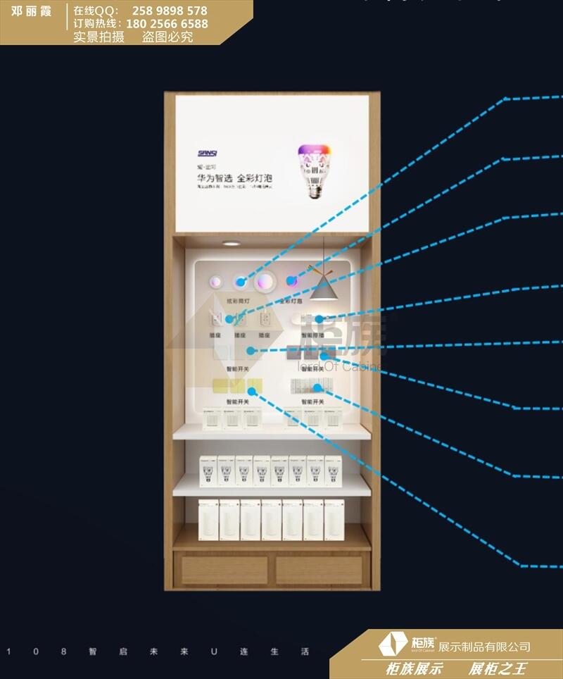 层板配件柜,上面的灯箱和层板的灯带齐整摆设起到很大的吸引作用,产品的展示离不开灯光的照射,但不是越多的越亮的灯光越好,过多过亮的灯光会导致刺眼而起到反作用,新升级版华为堡垒店2.0灯光建议选择暖色灯光,柔和的感觉能让顾客选择产品式更舒适。