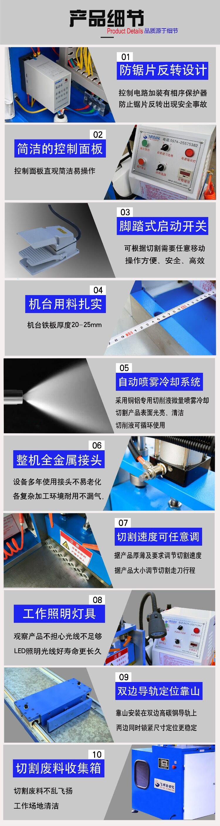 宁海飞研自动化设备有限公司是一家专业研发、生产与销售铝材切割机,铜材切割机设备企业,我们切割机产品主要包括全自动铜铝材切割机和半自动铜铝材切割机两大类,我们切割机产品广泛运用于汽车行业、摩托车配件、运动器材、休闲用品、电子产品、钢制家具等各大行业。我们拥有多年的铝型材切割机设备制造、安装、调试经验,不仅能为客户提供高精度、高品质、高性价比的切割机产品,同时我们还拥有完善的售后服务体系,能够为客户提供全面的售前、售中、售后服务和技术支持。我们始终坚持以服务、品质、诚信赢得业界的认可。欢迎各界朋友莅临参观、指导与业务洽谈。