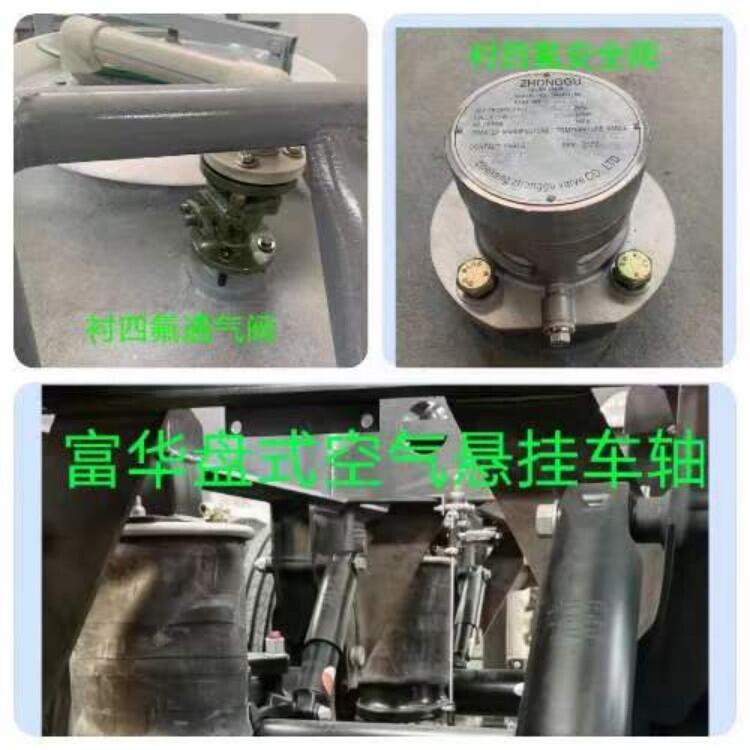 采用50#牵引销,富华10吨盘式制动车轴,带富华原厂空气悬架,防飞溅,前后两轴ABS,加装
