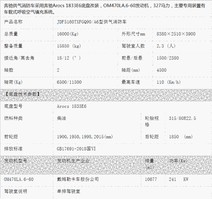江特牌JDF5160TXFGQ90/A6型供气消防车又叫奔驰进口供气消防车,该车采用进口奔驰Arocs1833E6底盘,主骨架为高强度铝合金+外蒙皮为高强度航空铝合金板,车厢两侧厢门为铝合金卷帘门(卷帘门两侧带灯带),后部为铝合金上翻门(后部设有铝合金折叠爬梯)。装配了BT-1500 车载型充气系统(充气质量符合欧洲Z高标准),德国原装进口1500L压缩机,原装进口P120空气过滤系统。储存系统-气瓶12只分为:4组(气瓶组设有安全阀、节流阀、压力表)。充瓶防爆箱同时填充8只碳纤维瓶(阶梯控制系统+PLC充气控制系统面板),空气系统具有安全、快速、洁净、简单、可靠等特点。照明系统包含:升降照明系统和车外照明。供气消防车具备强大的移动充气及保障能力,广泛应用于应急消防保障供气需求,极大的保证了消防员及待抢救人员的生命安全。生产厂家咨询热线:158 2678 7333(微信同号)