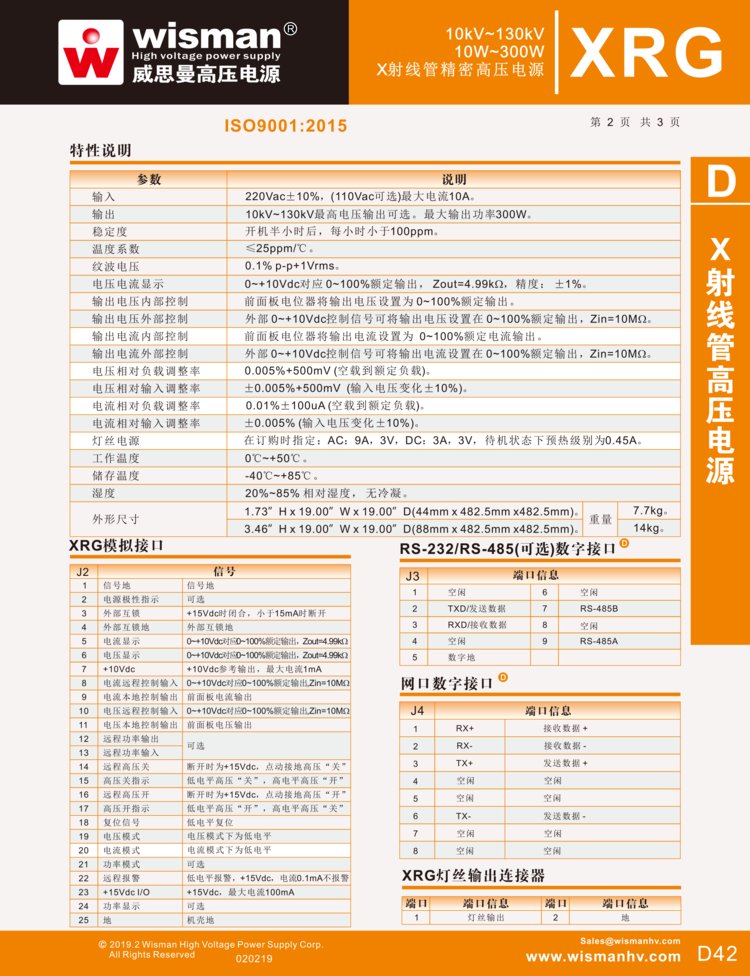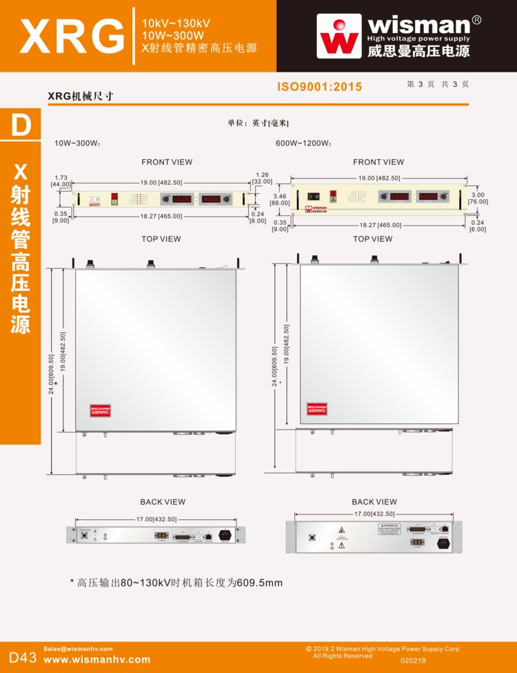威思曼XRG系列是高性能19’标准机架式高压电源,它可集成输出直流电压5.5V电流0.3A到3A可调的灯丝电源。高压和灯丝电流可实现线性平稳上升。XLG系列电源还可外接电位器实现输出电压和电流的远程控制,并且具有外接电压和电流显示、高压输出端过压和短路保护、安全互锁等功能。