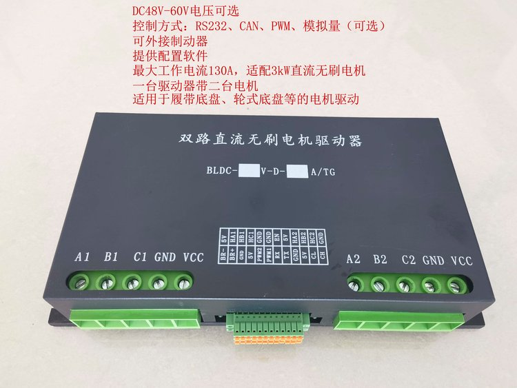 该系列双路直流无刷电机驱动器采用32位高性能处理器作为核心控制单元,可以同时控制两台直流无刷电机。驱动器使用电机内部的霍尔传感器作为转子位置反馈信号,可实现速度开环/闭环控制;多种控制信号(PWM、RS232、CAN总线),其中PWM信号控制包括单控模式和混控模式-单控模式:可实现两台电机完全独立控制;混控模式:可实现两台电机同步逻辑控制(前进、后退,左右旋转);通过CAN总线可将多个不同地址的驱动器挂载到同一条总线上,实现多驱动器联动控制;RS232接口可用于驱动器参数配置和驱动器控制。