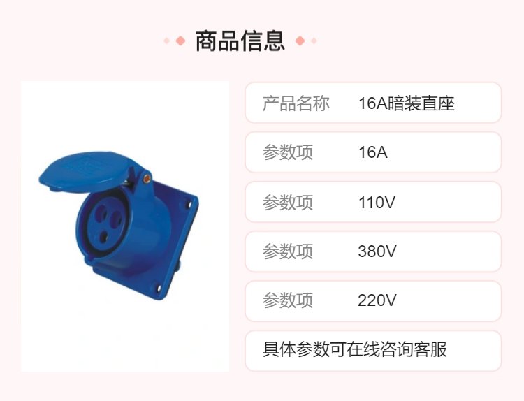 16A暗装直座工业插座。黄色是110V电压,蓝色是220V,红色是380V