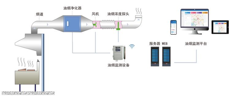 现场安装监测终端,实时监测油烟油烟净化器的工作状态,包括设备运行的电流等,同时结合排烟口的颗粒物浓度进行对比分析,一旦排放超标,系统会发出异常信号。