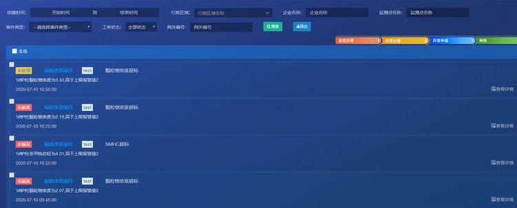 系统根据采集的油烟数值大小,产生对应的排放超标告警;对净化器的运行数据分析,上传净化设备对应的运行、停机、故障等告警事件。