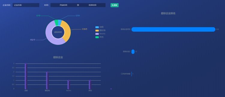 对相关的采集数据油烟、颗粒物、NMHC数据进行关联分析,对超标的种类、企业进行饼状图的展示,同时对报警企业进行排名,根据排名情况对相关企业进行数据和运行状态的分析评价。