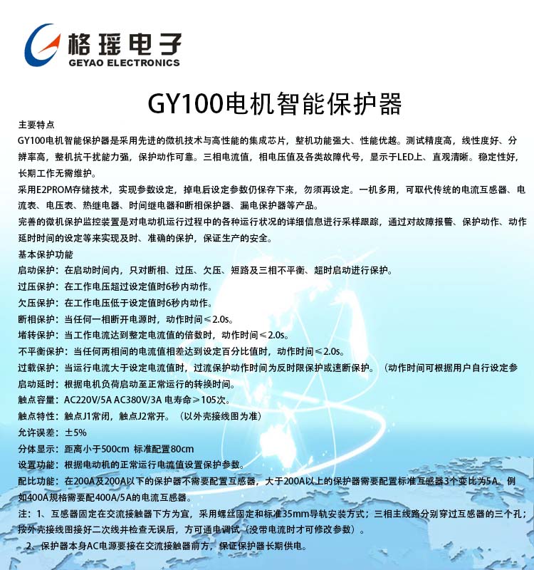 GY100电动机保护器由电流传感器、启动电流延时电路、过载反时限保护、缺相保护、堵转速断保护、及三相电路不平衡保护、过欠压保护、数值电流电压显示、故障显示记忆、单片机运算、故障动作部分组成。由电流传感器取得电流信号,经过整流、滤波、检测、识别等环节,送到相应部分进行比较处理。推动功率回路使继电器动作。