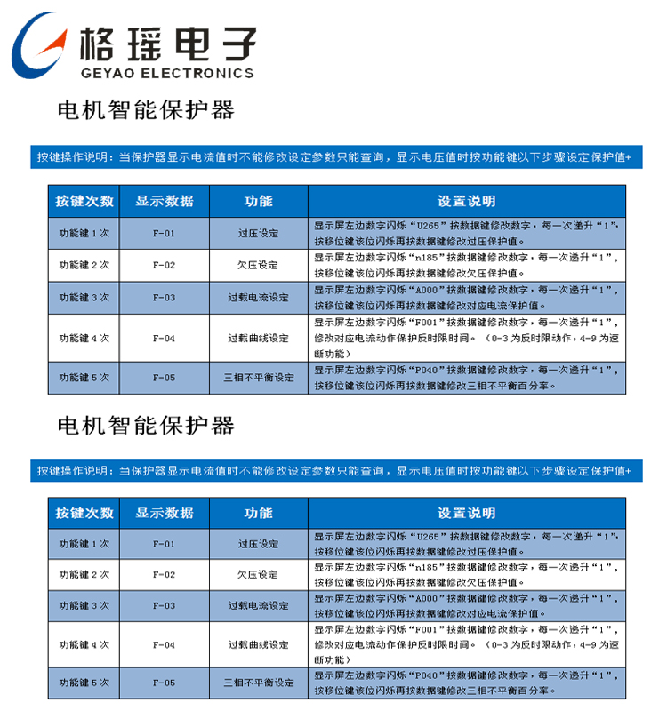 GY100系列电动机保护器在无运行时显示线电压,运行电动机无故障时,显示电动机的 A、B、C 相电流;在电动机发生漏电、短路、缺相、堵转、电流不平衡、过电流、过欠压等故障时,通过断开保 护器内的继电器触点停止电动机运行(LED故障指示灯亮),同时显示故障代码指示电动机的故障类型,并且还显示发生故障值。