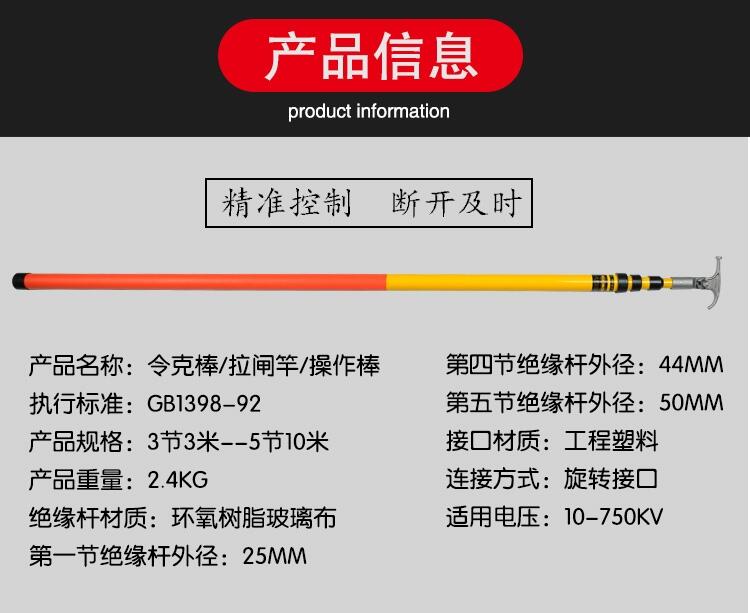 一、产品介绍:绝缘操作杆高压拉闸杆(又称绝缘操作棒、绝缘杆、高压操作杆,俗名多用令克棒)采用优质玻璃纤维布、环氧树脂和306树 脂苯酐,玻璃钢纤维布以及固化剂等几大绝缘材料制成,经过第一次高温然后在模具上初次定形,然后取下模具,经过第二次高温打磨,一次粗打磨,两次细打磨, 然后在上漆制作成其它玻璃钢制品,外表美观、结构轻巧、操作方便,具备优良的机械电气性能,适合各种高压条件下使用,绝缘性能良好使用安全。