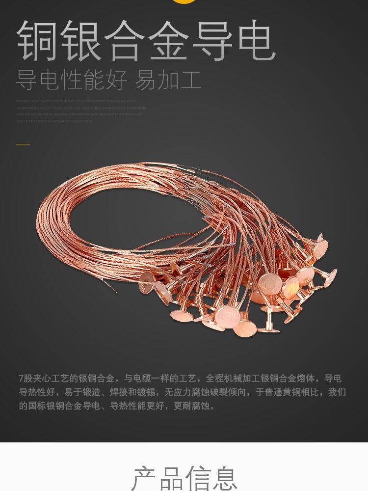 7股夹心工艺的银铜合金,与电缆一样的工艺,全程机械加工银铜合金溶体,导电导热性好,易于锻造、焊接和镀锌,无应力腐蚀破裂倾向,于普通黄铜相比,我们的国标银铜合金导电、导热性能更好,更耐腐蚀。