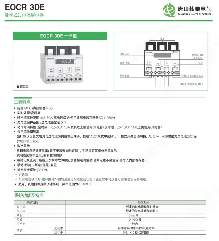 唐山韩雅电气设备有限公司代理销售EOCR3EZ-WRAM7A,EOCR3EZ-WRAF7A,EOCR3EZ-WRABA,EOCR3EZ-WRAZ7A过电流、缺相、堵转、反转、不平衡和漏电保护器。数码型显示,可实时监测运行电流值和漏电电流值,故障脱扣后可查询故障原因及漏电电流值大小,可适用于各种复杂工业环境中。