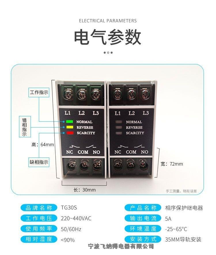 TG系列三相电源监视器适用所有三相电器的保护器。通用性TG30 380V、 50Hz/60Hz均可使用),体积超小,外观非常漂亮,是电器,电机正常,稳定工作的良伴侣,作为对各种三相电动机及其它三相设备(如制冷压缩机、水泵、风机、空压机、电梯、注塑机),输入电源的三相电压缺相、逆相及三相电压不平衡提供继电保护。