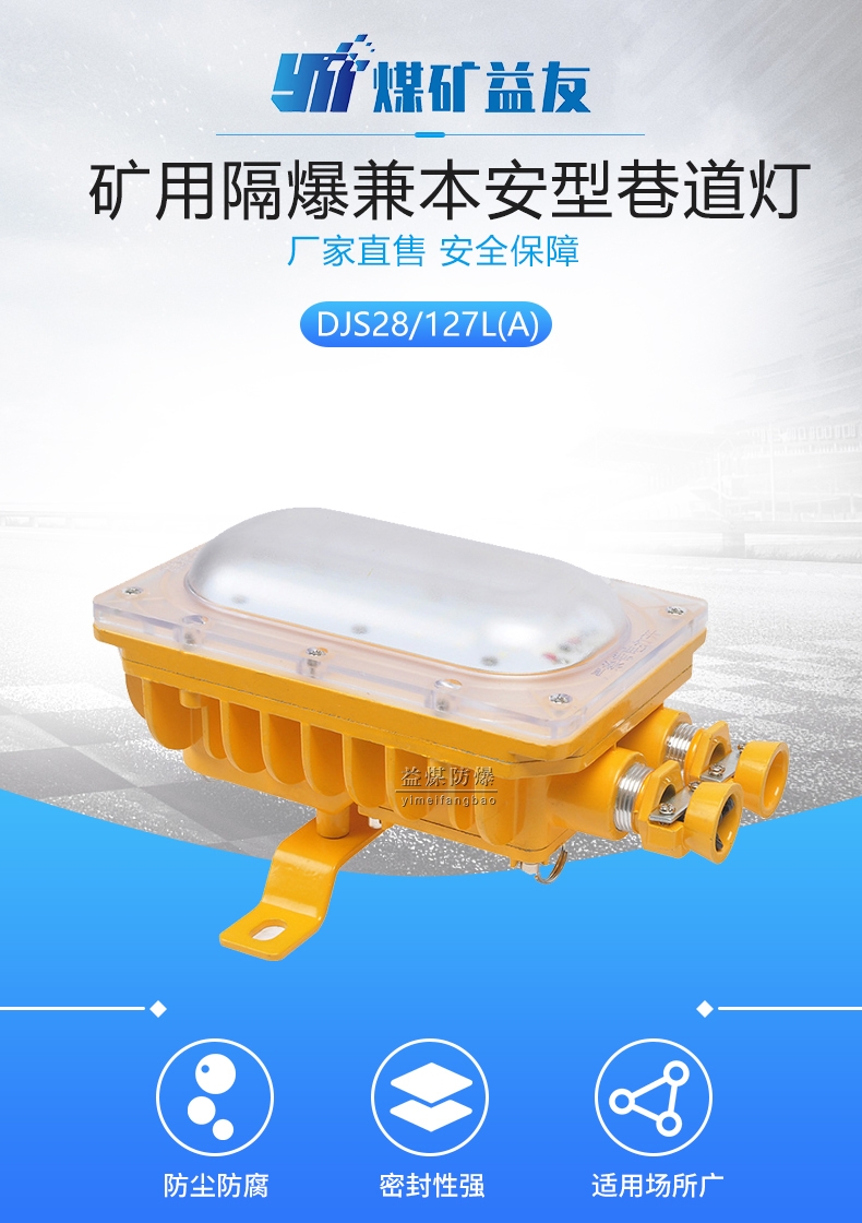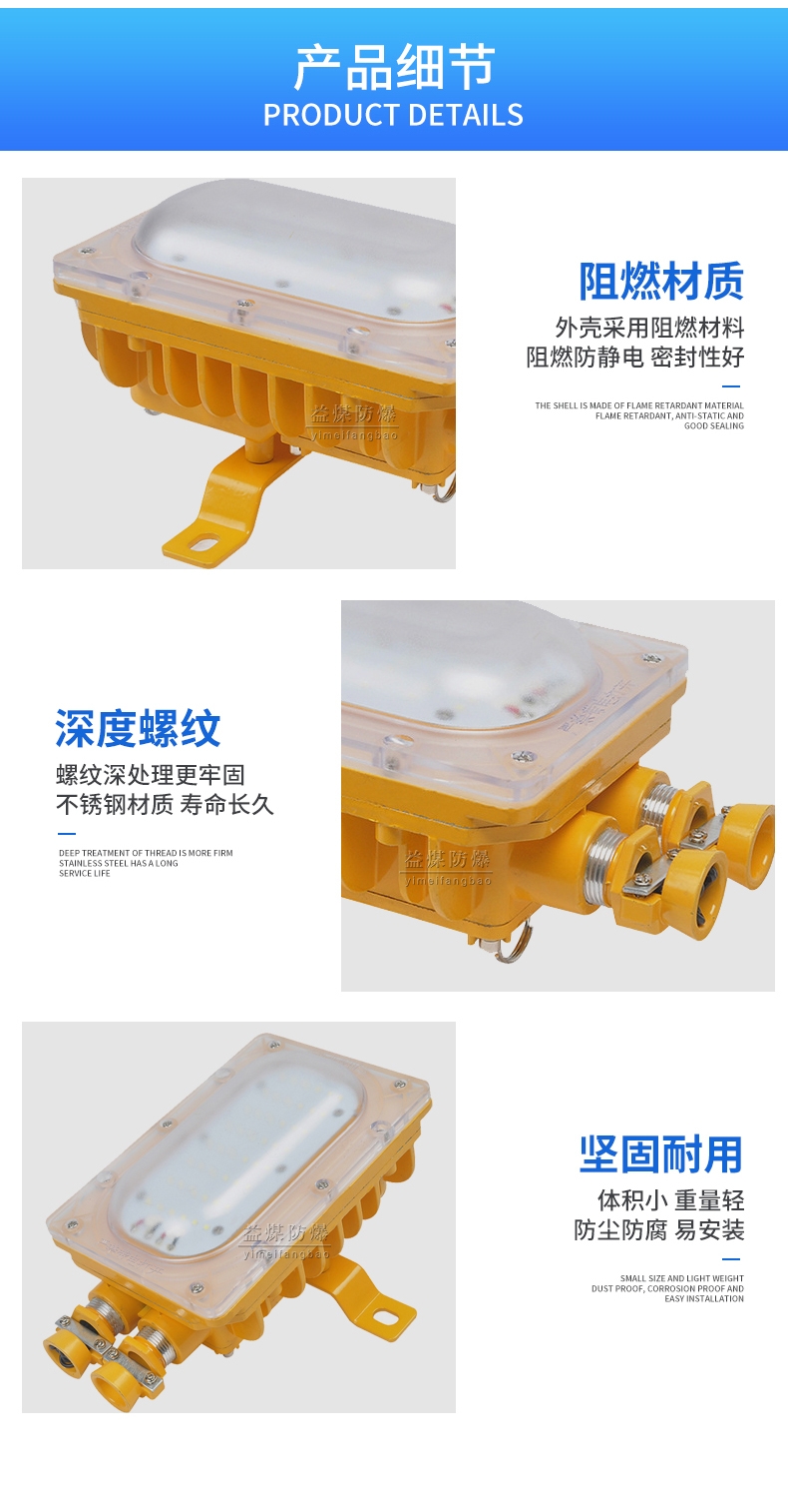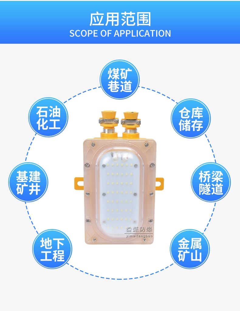 主要特点:1、该灯具采用大功率LED作为光源,功耗极低,在同等照度下,耗电量为白炽灯的1/10,节能荧光灯的1/2,具有明显的节能效果。2、该光源采用直流、低压供电,无频闪和电磁干扰,无红(紫)外辐射、无荧光灯中的汞蒸汽等污染物,符合欧盟未来灯具生产标准,是安全、健康的照明光源,环保。3、该灯具采用电源、光源及接线单独分腔的独特设计,使得整灯不仅外型美观,便于安装,而且大大提高了灯具的防爆、抗冲击、抗震动、高散热性能,各项指标完全符合矿用防爆灯具的国家及行业标准。