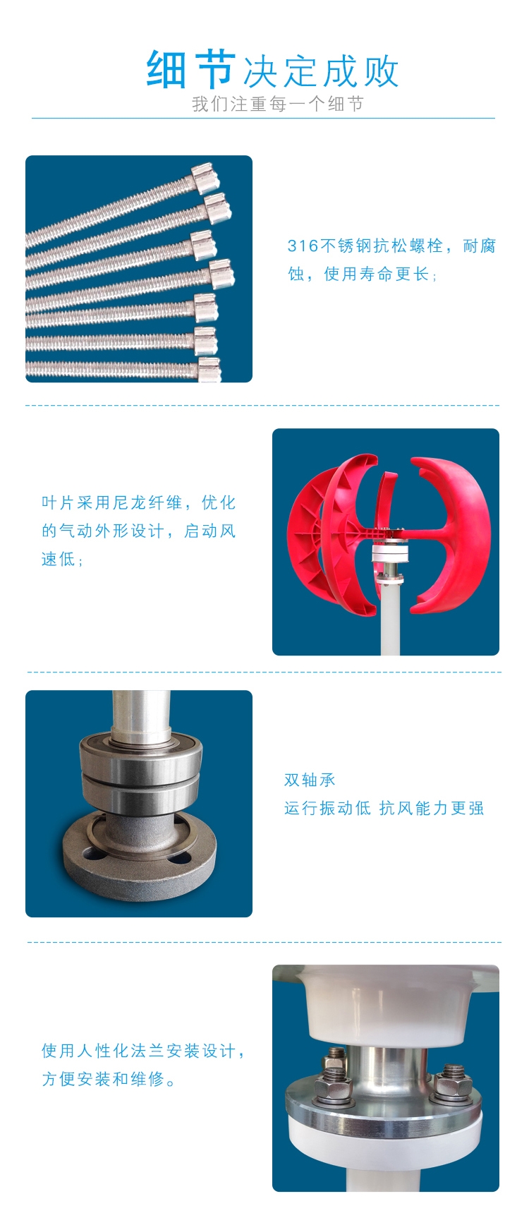 1.风轮结构简单,轮毂采用成熟的定浆结构,无复杂活动机械器件,免维护,故障率极低。