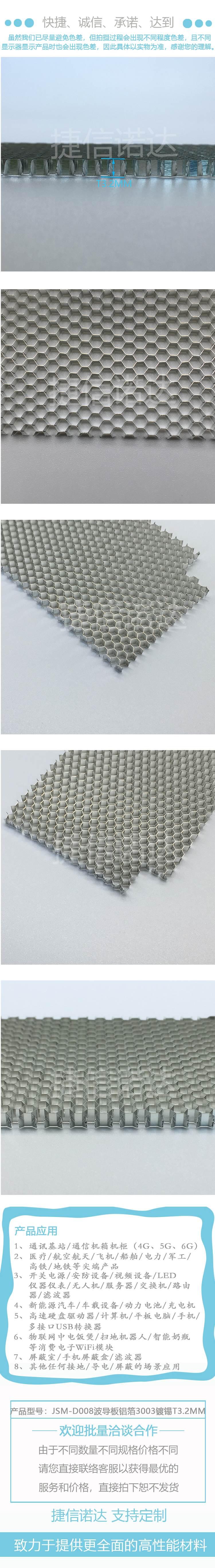 在屏蔽设计中使用的是截面为六边形的截止波导构成的蜂窝状通风孔,又称蜂窝波导板。这样的波导板可以形成很大的通风面积,同时又能够有效的防止电磁辐射干扰。根据波导原理设计的蜂窝状通风屏蔽产品。在达到电磁屏蔽效果的同时,可以有很好的通风效果和尘埃过滤功能。截止波导板有铝制和钢制两种,铝制波导板具有通风量大、重量轻、抗电化腐蚀性能较好的突出优点。