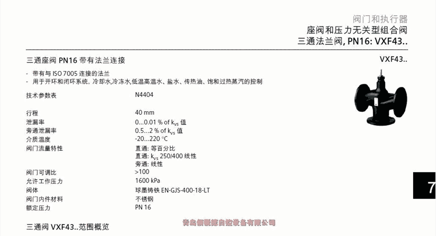 ACVATIX?二通和三通座阀 PN 16,法兰连VVF47..VXF47..· 球墨铸铁 EN-GJS-250 或更高材质的阀体· DN 50…150· kvs 40…315 m3/h· 可以配备 SBX..、SBV.. 执行器用于在暖通空调系统中作为控制阀。 仅适用于闭式系统。型号概览