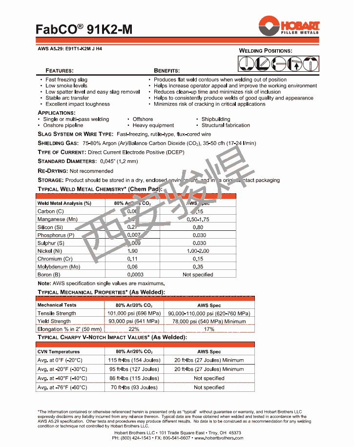 美国赫伯特FabCO 91K2-M管道焊丝X80药芯焊丝