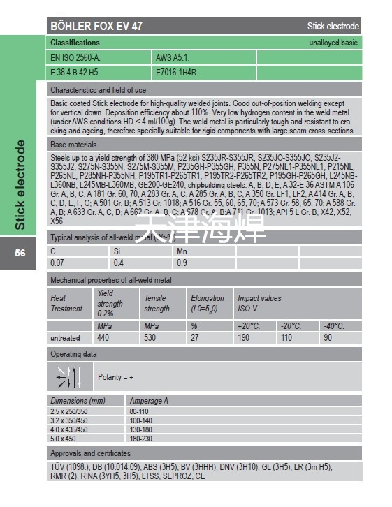 B?hler fox ev 47是一种基本的涂层棒状焊条,强度较低,但焊缝金属韧性和韧性很好,焊缝金属中极低的氢含量支持这一特性,避免了氢致裂纹。此外,防潮涂层是另一个配套特征。这一特点使得在重新背衬后使用电极的时间更长成为可能。在钢结构中有着广泛的应用,尤其是对于较大的、刚性的、大的墙体截面部件,需要进行强韧的连接。天津海焊