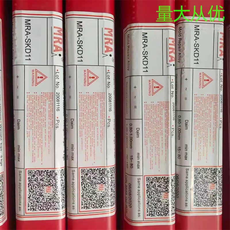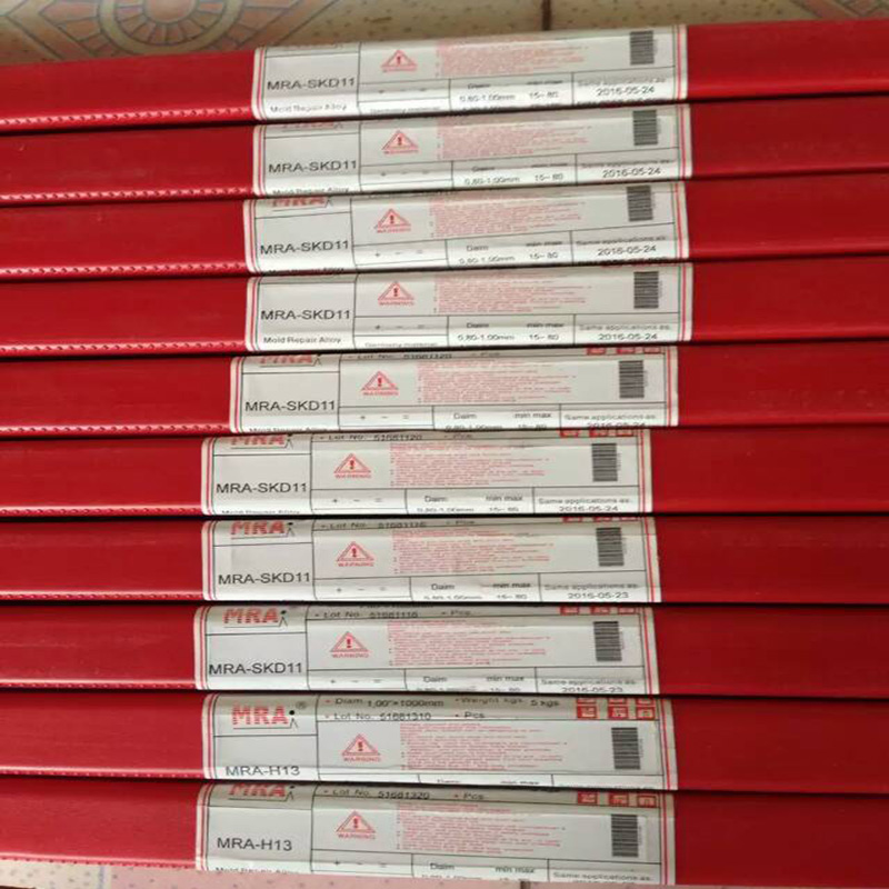 ★SKD11 焊补冷作钢、五金冲压模、切模、刀具、成型模、工件硬面制作具高硬度、耐磨性及高韧性之氩焊条,焊补前先加温预热,否则易产生龟裂现象。规格1.0 ~ 3.2mm HRC 56~58