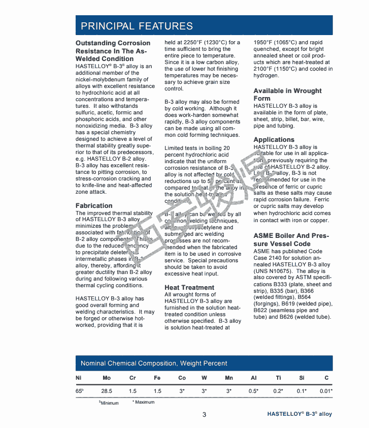 Exceptional resistance to HCl and H2 SO4 and enhanced structural stability HASTELLOY® B-3® alloy (UNS N10675) exhibits extremely high resistance to pure hydrochloric, hydrobromic, and sulfuric acids. Furthermore, it has greatly improved structural stability compared with previous B-type alloys, leading to fewer concerns during welding, fabrication, and service. Like other nickel alloys (in the mill annealed condition), it is ductile, can be formed and welded, and resists stress corrosion cracking in chloride-bearing solutions. Also, it is able to withstand fluoride-bearing media and concentrated sulfuric acid, both of which result in damage to zirconium alloys. It is used in numerous chemical process industry (CPI) applications, especially in the construction of reaction vessels for pure, reducing acid service.