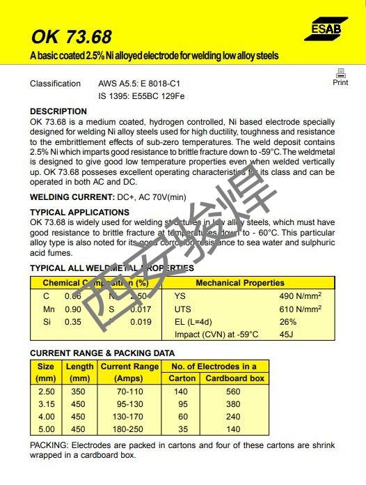 OK 73.68瑞典伊萨低温钢焊条E8018-C1进口焊条