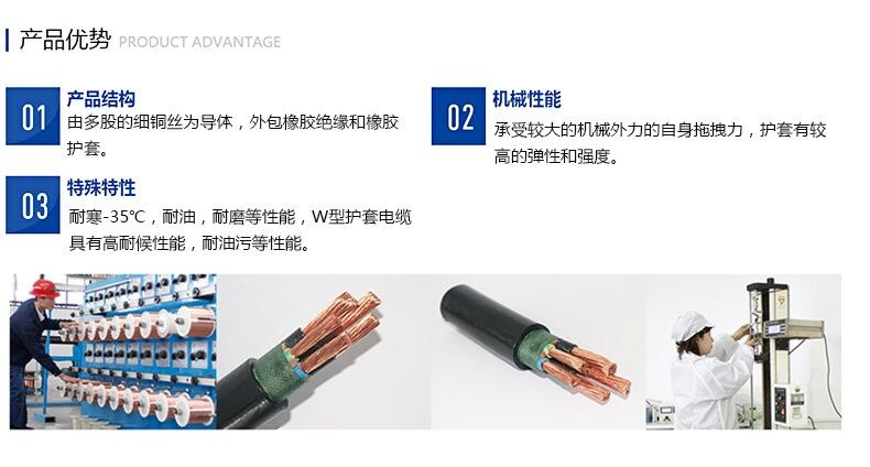 3、 特殊特性:耐寒-35℃,耐油,耐磨等性能,W型护套电线具有高耐侯性能,耐油污等性能