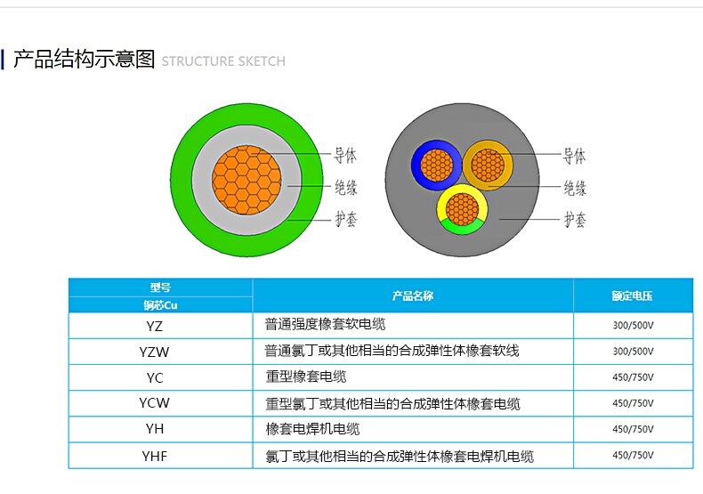 1、 产品结构:由多股的细铜丝为导体,外包橡胶绝缘和橡胶护套
