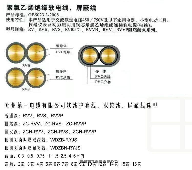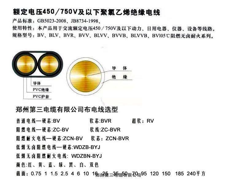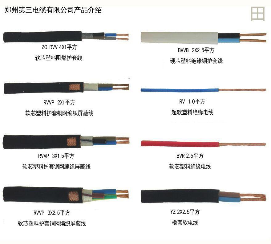 郑州第三电有限公司主要生产销售:BVR家装电线,BV工装电线,RVV安防工程电线,YJV电力电缆,YC橡套电缆,ZC-YJV架空电缆,YJV22地埋电缆,KVV控制电缆,RVVP信号电缆,阻燃电缆,耐火电缆,低烟无卤阻燃耐火电缆,焊机电缆,BVVB电源线,网线,电视线,RVS消防线等。