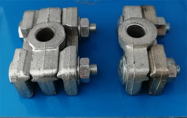 (1)电机车滑线夹、单线夹、吊线线夹(DXK-1)在矿山电机车架线中起着吊线作用,是电车线的吊线配件,线夹设计结构合理,安装使用方便,是镀锌铸铁成型件,耐磨耐腐蚀。线夹分铸铁镀锌线夹和铜线夹两种。结构形状是两片,顶部有螺丝孔,孔径是¢16,其中一片夹板设计为方孔,螺杆底部为方形,防止在紧固螺母时转动。单线夹需和瓷瓶(CD-1)、牵线器(XK-1)配套使用。