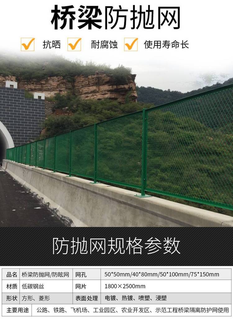 网片经浸塑,特别适合于桥梁防抛网,十年防锈拆装便当,重复运用性好,可根据需要对围网从头布局环保产品,终可回收运用,用途:用于公路、铁路、飞机场、工业园区、农业开发区、演示工程阻隔防护网运用。