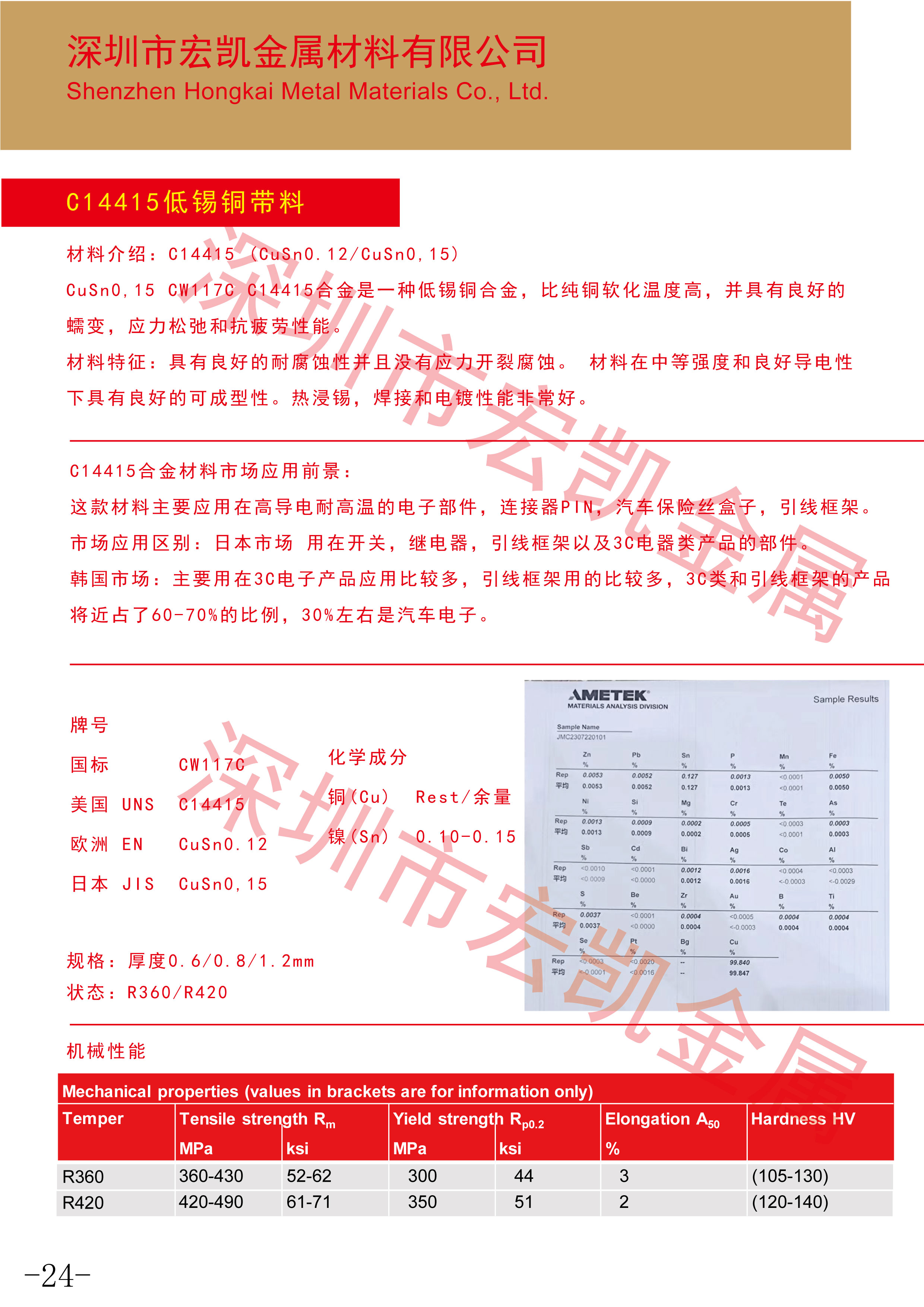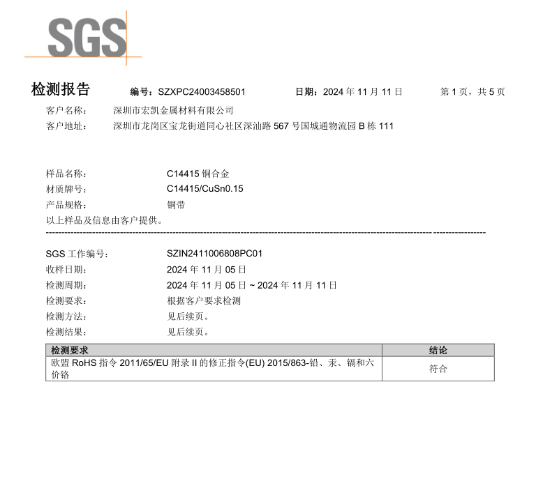 CuSn0,15 CuSn0.12 CW117C C14415合金是一种低锡铜合金,比纯铜软化温度高,并具有良好的蠕变,应力松弛和抗疲劳性能。