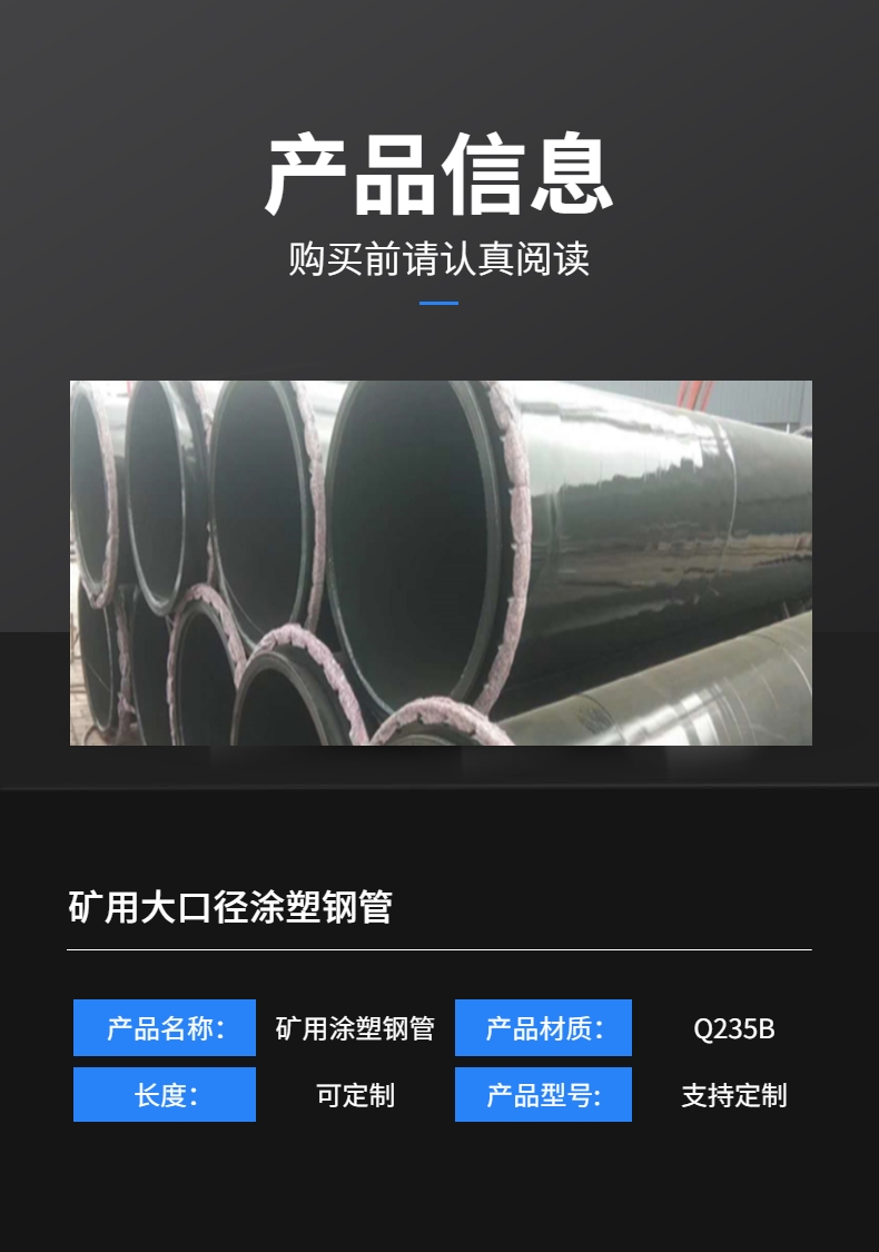 煤矿用涂塑钢管,又名涂塑管、钢塑复合管、涂塑复合钢管,是以钢管为基体,通过喷、滚、浸、吸工艺在钢管(底管)内表面熔接一层塑料防腐层或在内外表面熔接塑料防腐层的钢塑复合钢管。涂塑钢管具有优良的耐腐蚀性和比较小的摩擦阻力。环氧树脂涂塑钢管适用于给排水、海水、温水、油、气体等介质的输送,聚氯乙烯涂塑钢管适用于排水、海水、油、气体等介质的输送。
