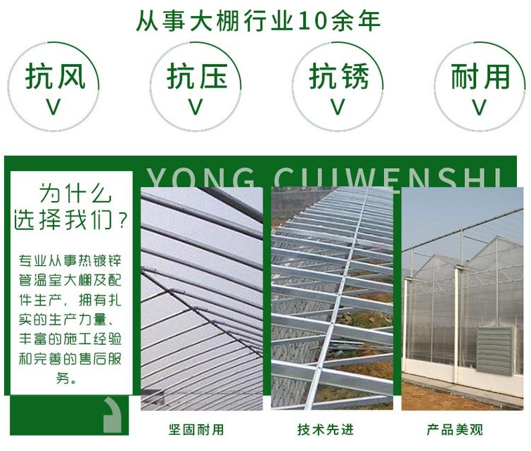 大棚配件产品主要有:棚管(拱管)、棚管接头、玻璃温室钢丝夹(压顶簧)、纵拉管(大小头、有眼)、钢架大棚斜拉撑、U型卡、棚卡槽、卡簧(包塑)、卡槽双接头(连接片)、各种连体大棚管槽固定器、固定夹圈(夹箍)、棚门组合、门铰组合(搭口)、棚管直管(门头管)、塑料夹(压膜卡)、管管卡等各种大棚钢管。