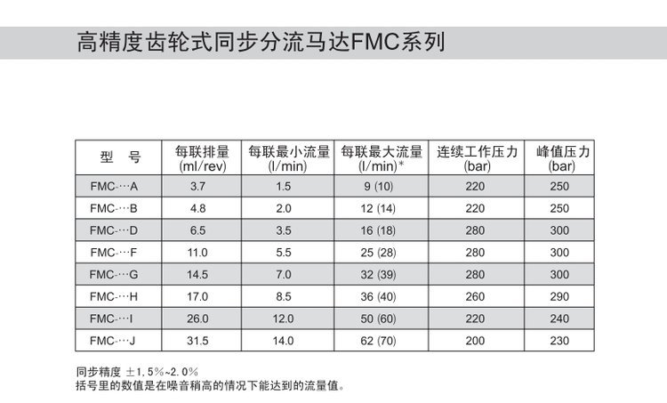 JEONFF同步马达,FMC系列同步马达属于铝合金齿轮式同步马达,体积小,流量范围广、可承受工作压力高、可组合多达12流。JEONFF铝合金同步马达单流流量:3-60 L/min; 工作压力可达:250 bar,其同步精度在±1.5-±2.5之间,被广泛应用于冶金、港口等行业。
