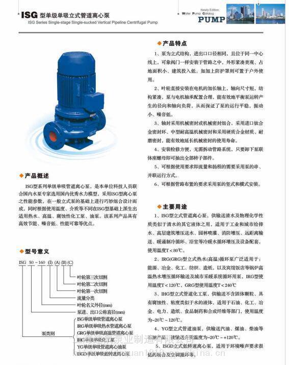采用IS型离心泵之性能参数,在一般立式泵的基础上进行巧妙组合设计而成。同时根据使用温度、介质等不同在ISG管道离心泵型基础上派出适用热水、高温、腐蚀性化工泵、油泵。该系列产品具有 噪音低 等优点。ISG型管道泵是此泵系列中的基础款,根据不同的输送介质和温度等方面的选型要求延伸有IRG立式热水循环管道离心泵、GRG型立式高温管道泵、IHG立式化工离心泵、YG立式管道离心油泵、IHGB立式防爆不锈钢管道离心泵、ISGB防爆管道离心泵等型号泵种类
