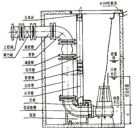 注:需随泵提供特制专用起重吊钩+尼龙导绳,起吊时可将起吊勾导入挂在潜水泵的提拔上。
