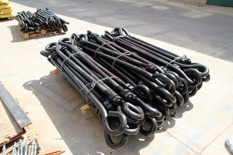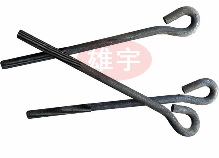 地脚螺栓是埋设在地面或者基础里面,把大地或者基础和机器设备连接起来的工具。一般用Q235钢,即为光圆的。螺纹钢(Q345)强度大,做螺母的丝扣没有光圆的容易。对于光圆地脚螺栓而言,埋深一般为其直径的25倍,然后做一个120mm左右长的90度弯钩。 如果螺栓直径很大(如45mm)埋深太深的话,可以在螺栓端部焊方板,即做一个大头就可以了(不过也是有一定要求的)。埋深和弯钩都是为了保证螺栓与基础的摩擦力,不至于使螺栓发生拔出破坏。地脚螺栓有固定没有强烈振动和冲击的设备等作用。