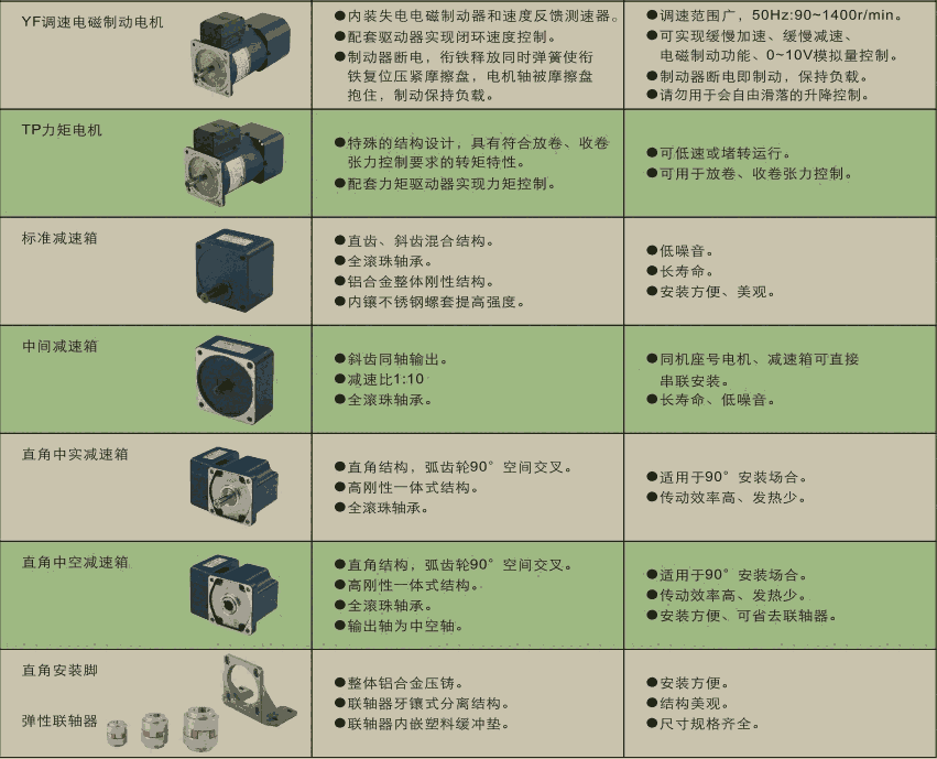 内装速度反馈测速器,配套调速器,实现闭环速度控制,调速范围广,50HZ:90-1400r/min,可实现缓慢加速,缓慢减速,快速停止0-10V模拟量控制。