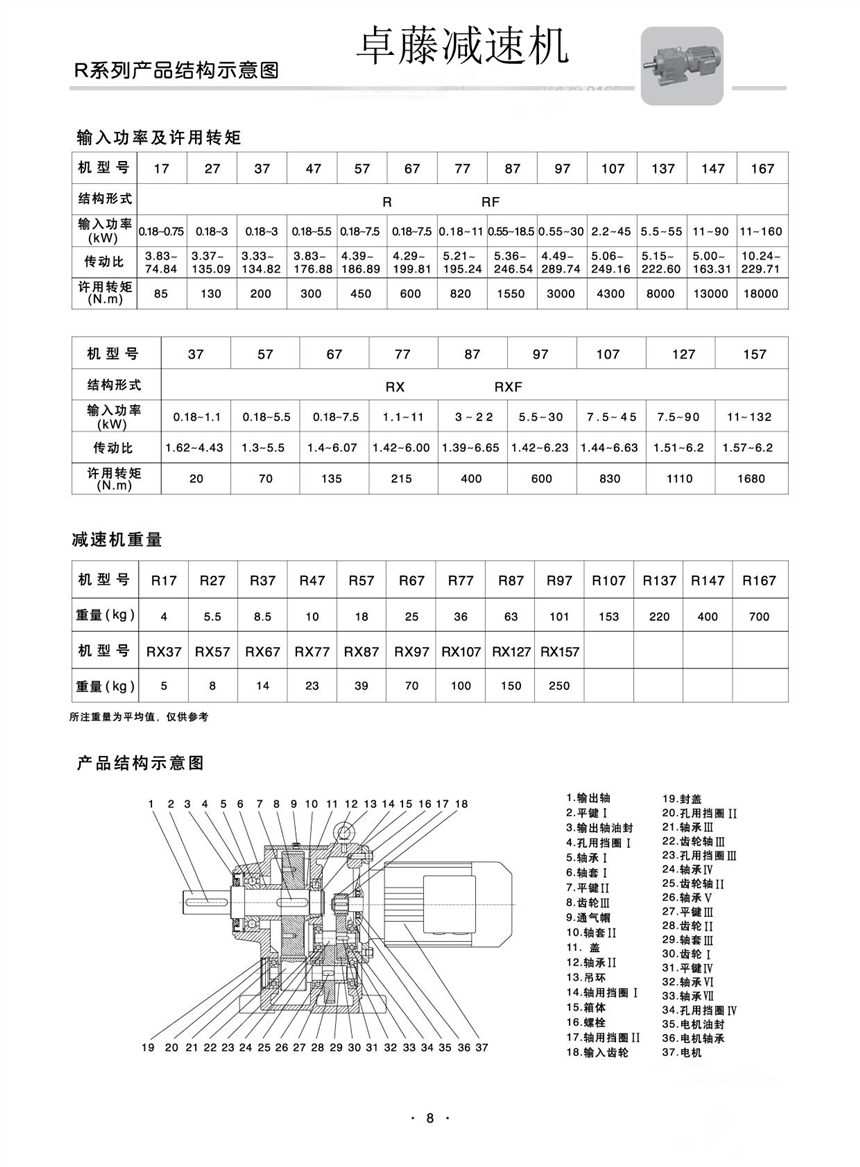 速比范围:R基本型3.33~289.74,RX型1.3~8.65,R/R组合型可达到27001